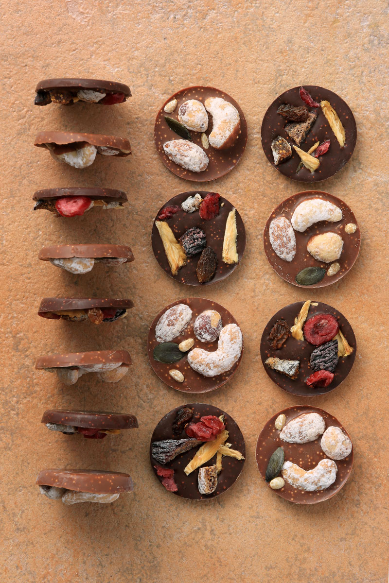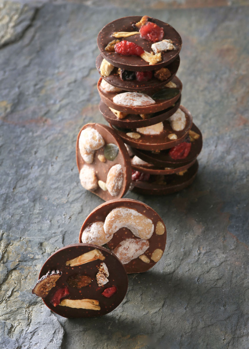 ・ビターチョコレートとコーンフレーク、シナモン風味 愛らしい円形には、パイナップル、クランベリー、白無花果、黒無花果、レーズンをあしらいました。