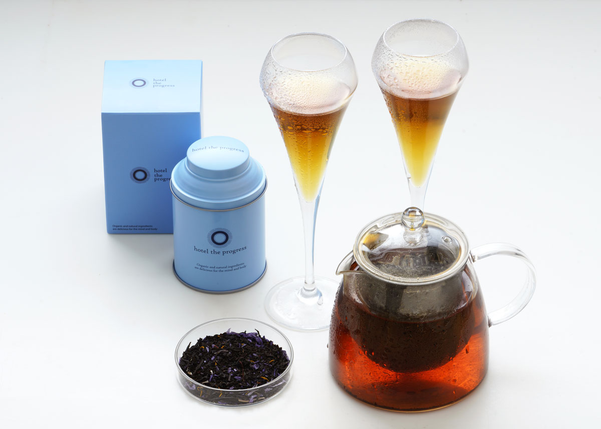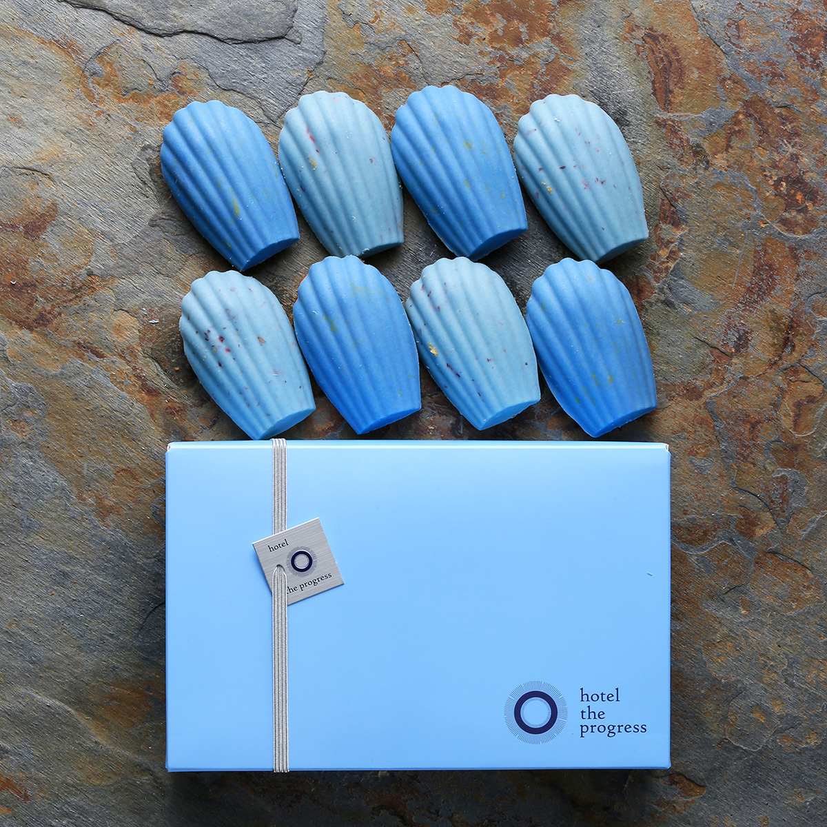 ホテルズプログレスのイメージカラーである2種類の青いチョコレートでカバーリングした、薔薇が香る特別なマドレーヌです。